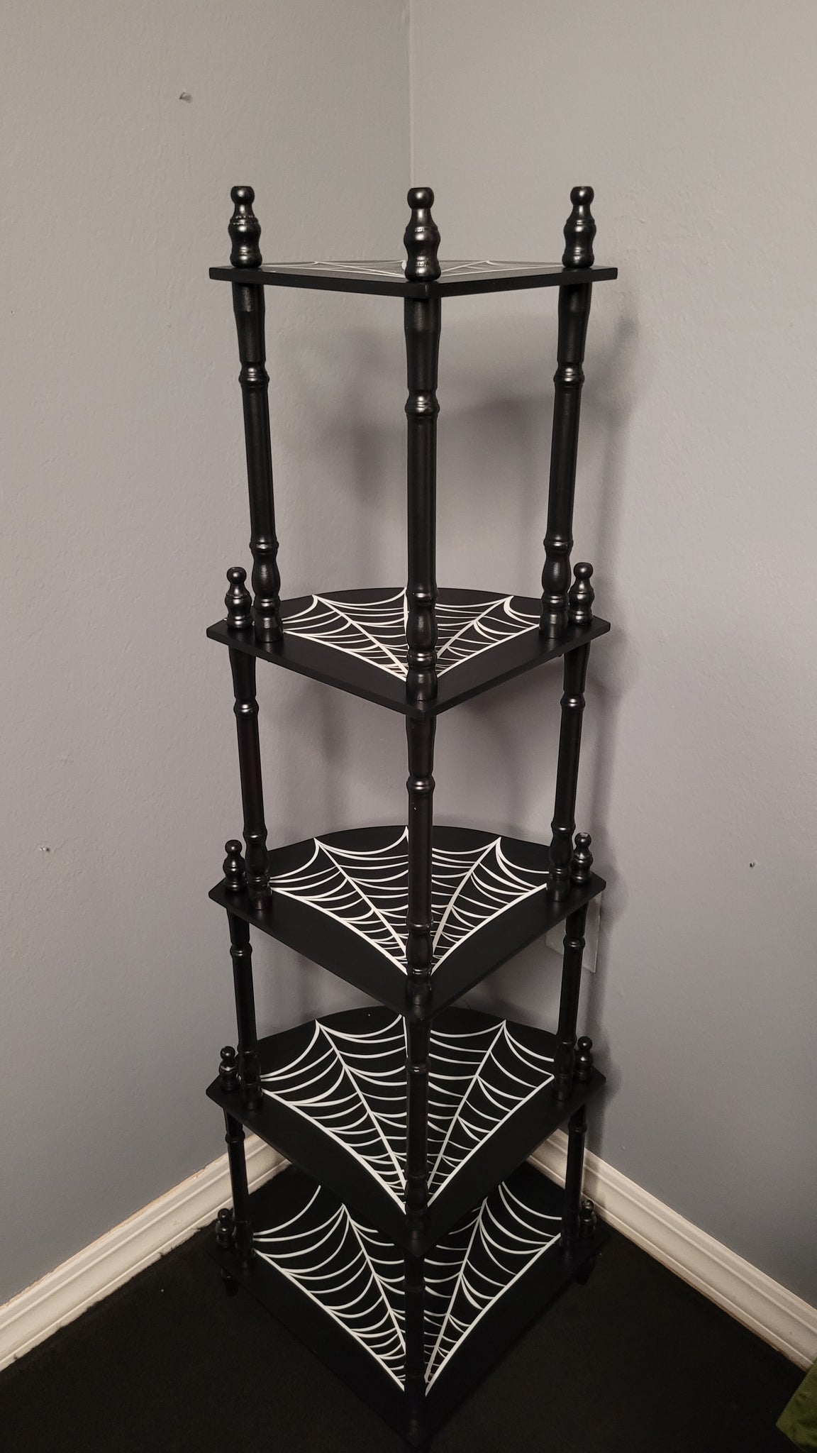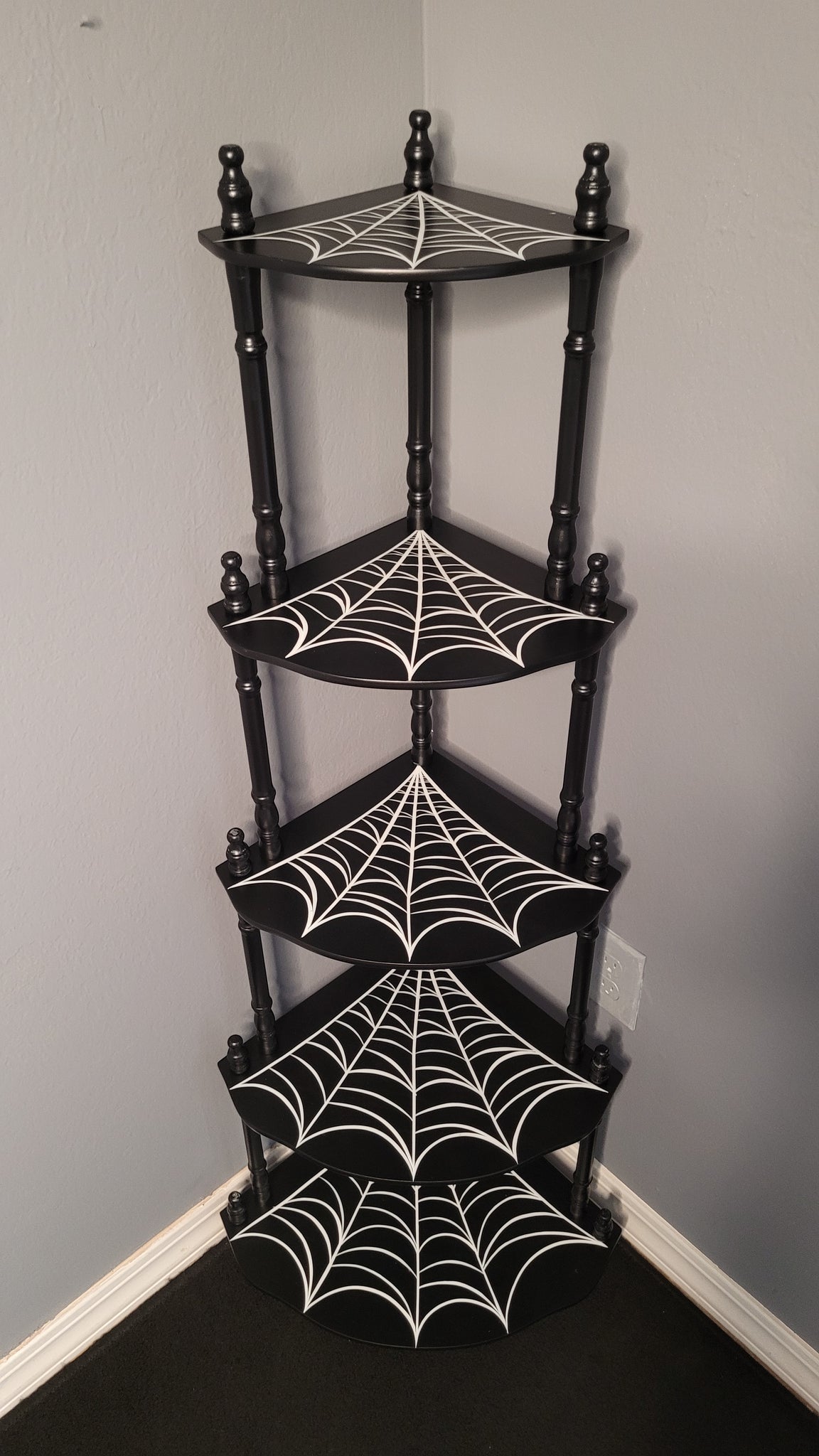 Our New Cobweb Corner Shelf measures 47.57 x 20 x 14.5 x in. Perfect for displaying your collectibles. Black Base with white pinstriped webs by our House artist @mannymurders A Matte top coat is applied to protect pinstriping. Assembly required. 7-10 days for your order to ship.