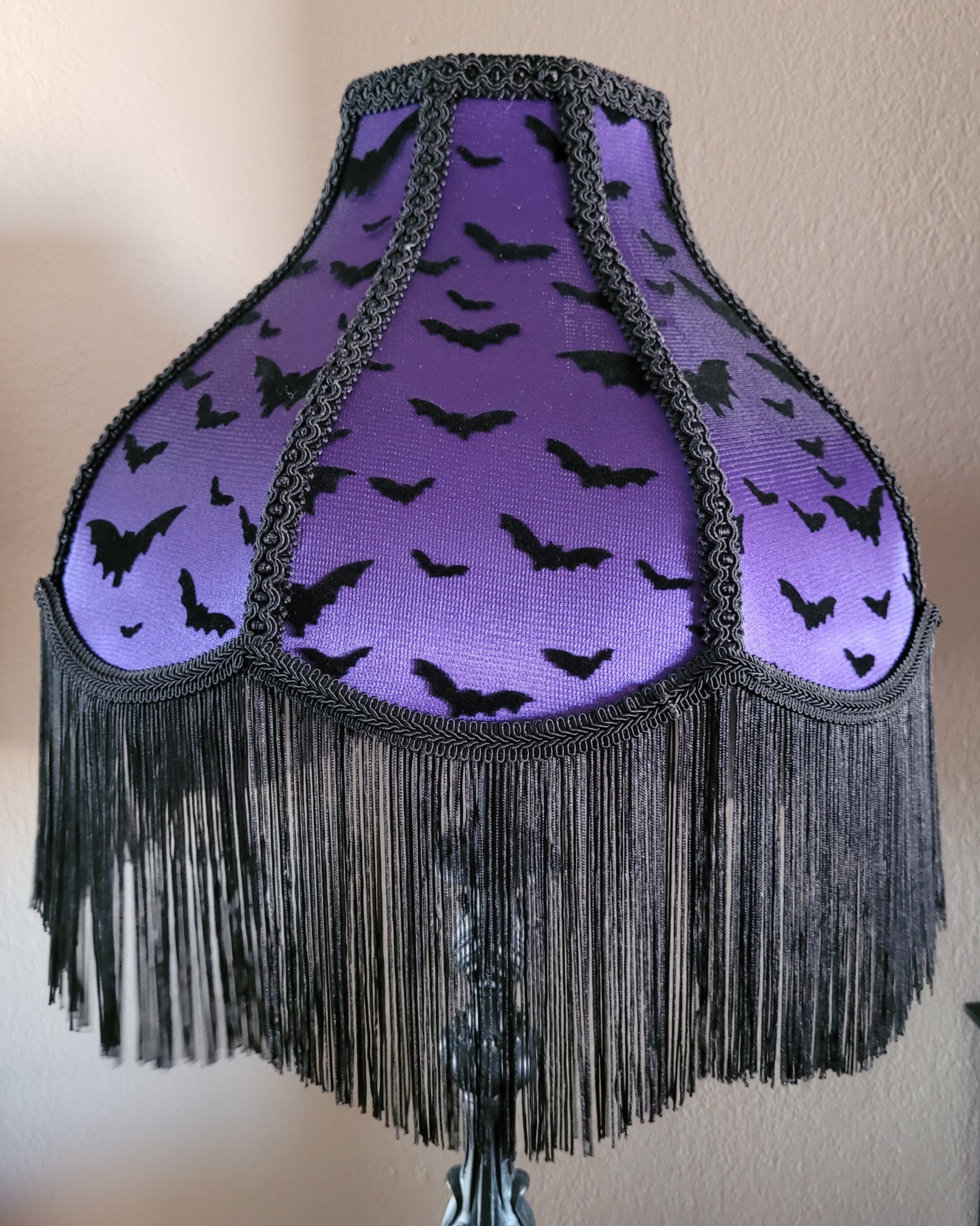 Purple Satin Base with Black Bat mesh fabric overlay. Black trim, 6"Black Fringe accent. Has spider fitter.